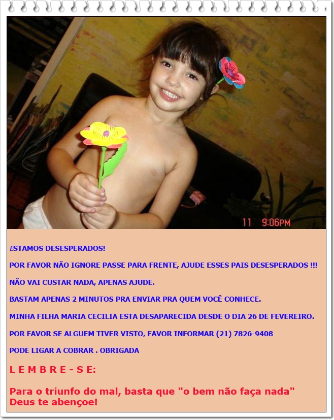 | Compartilhar Hiperdesesperadamente esta campanha de busca por uma menina que já foi encontrada, anos atrás. |